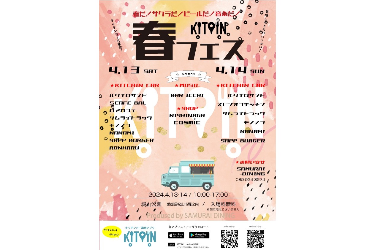 4月13日14日に松山市堀之内公園にて【KITPIN春フェス】を開催いたします。 KITPIN登録キッチンカーのお食事と、音楽のイベントです。 今年は【KITPIN春フェス宝くじ】も同時開催。 みなさんお誘い合わせの上、ご参加ください!
